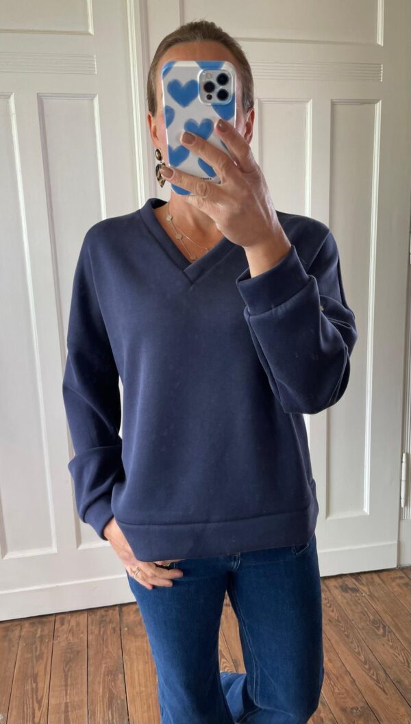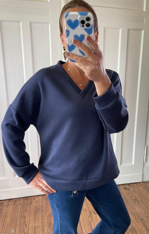 Das V – Ausschnitt Sweatshirt hat eine extrem feine Haptik und wirkt dadurch etwas feiner, als wir es von Sweatshirts im Allgemeinen kennen.