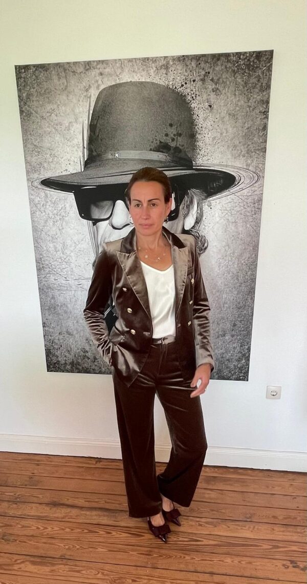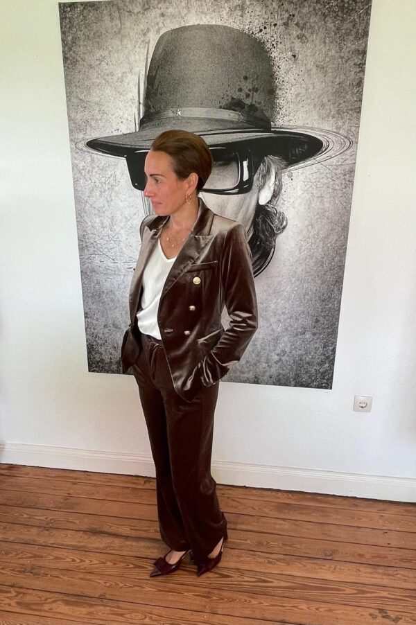 Natürlich kannst du ihn auch getrennt tragen – den Blazer zum Beispiel zu einem Kleid. Die Hose mit einer Seidenbluse und einer langen Strickjacke.