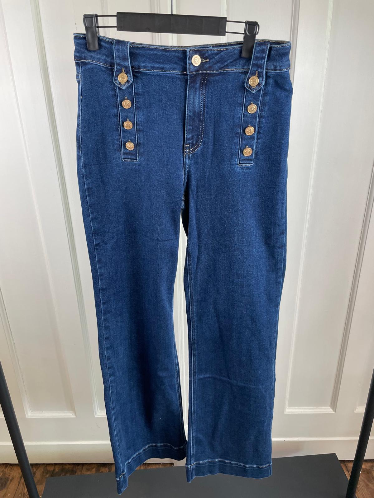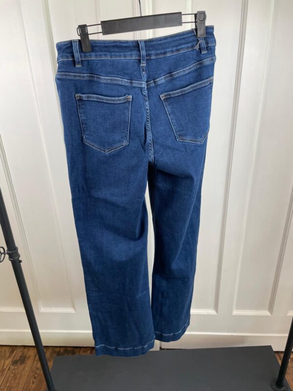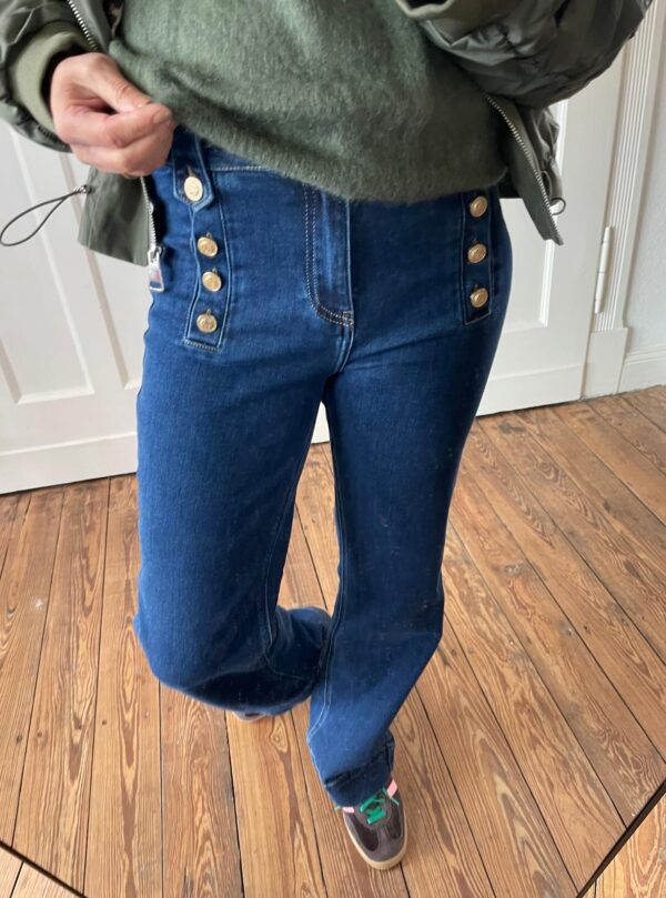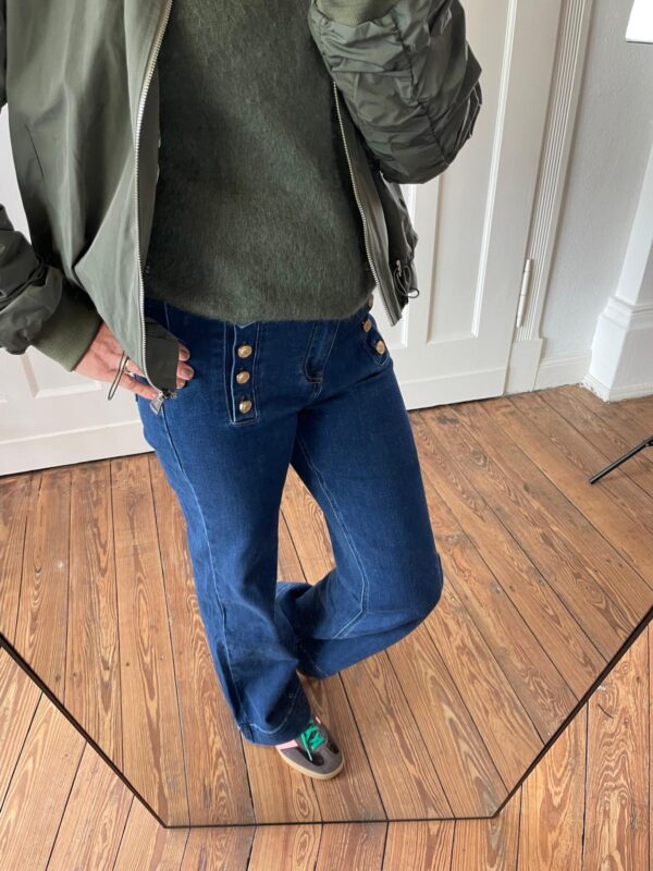 Sie hat eine etwas höhere Taillenhöhe und wird mit einem Reißverschluss und einem Knopf verschlossen.