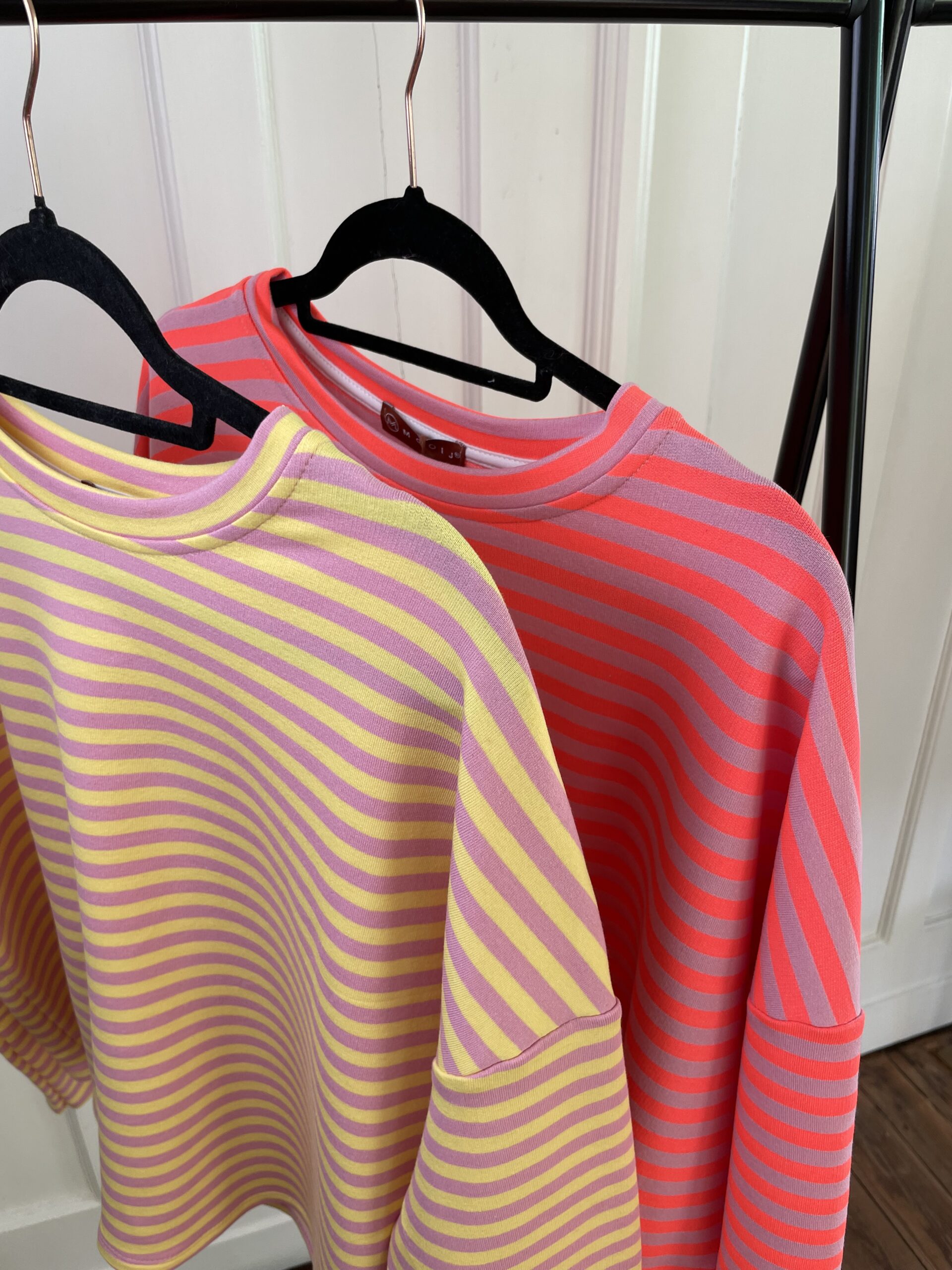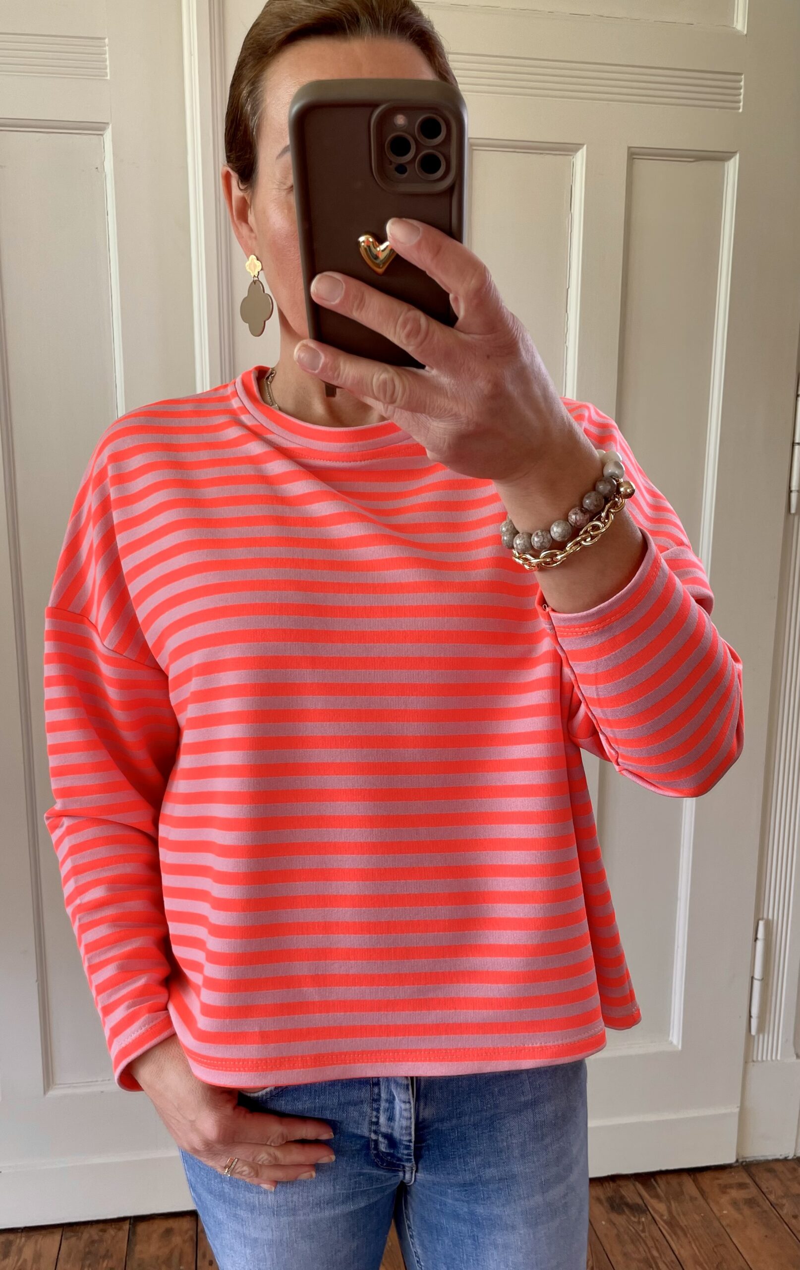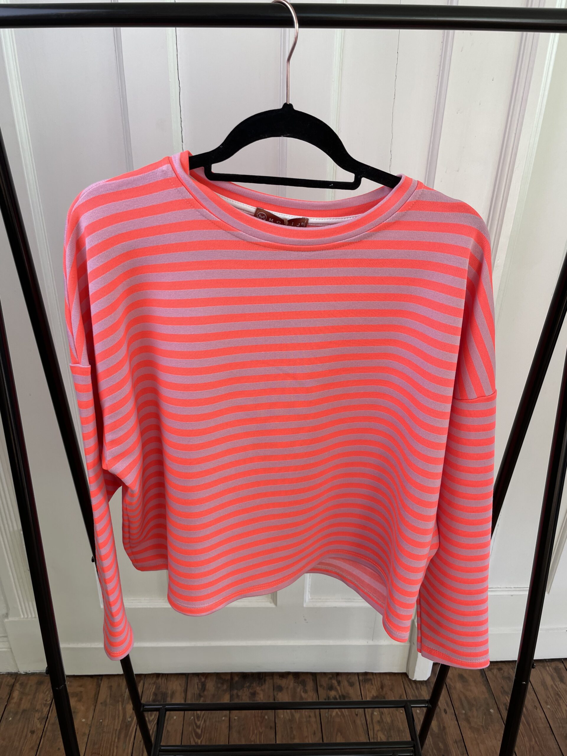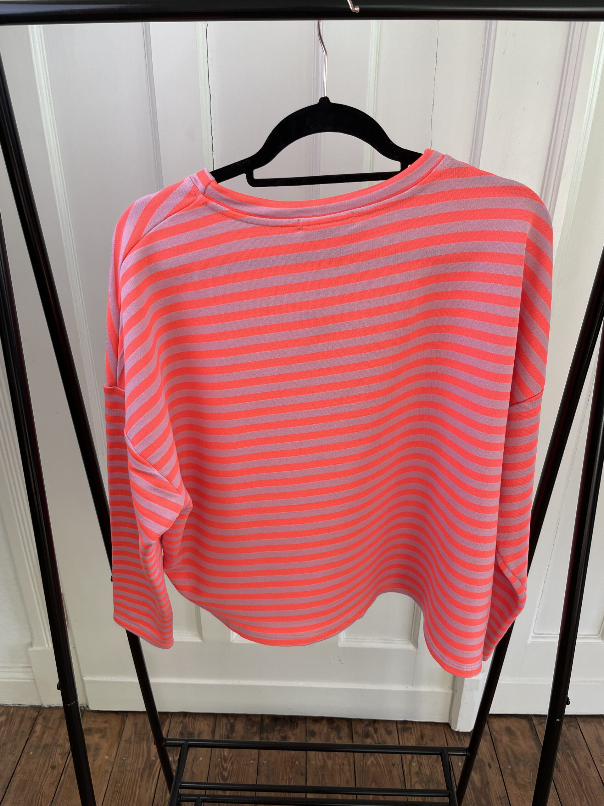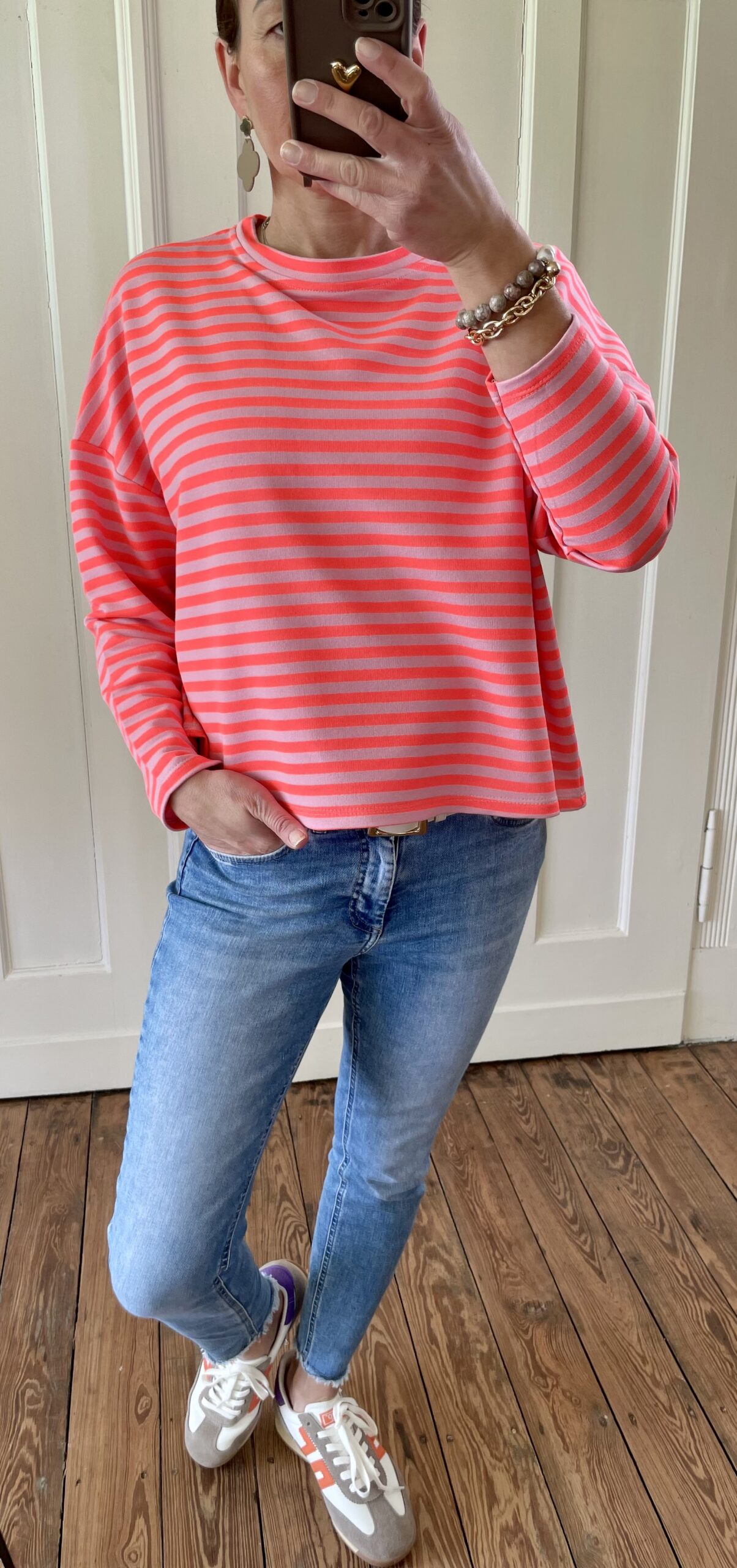 Neon Pink Rosa gestreift und sehr frisch. Du kannst es sehr gut unter einem Blazer tragen oder auch unter Strickjacken.