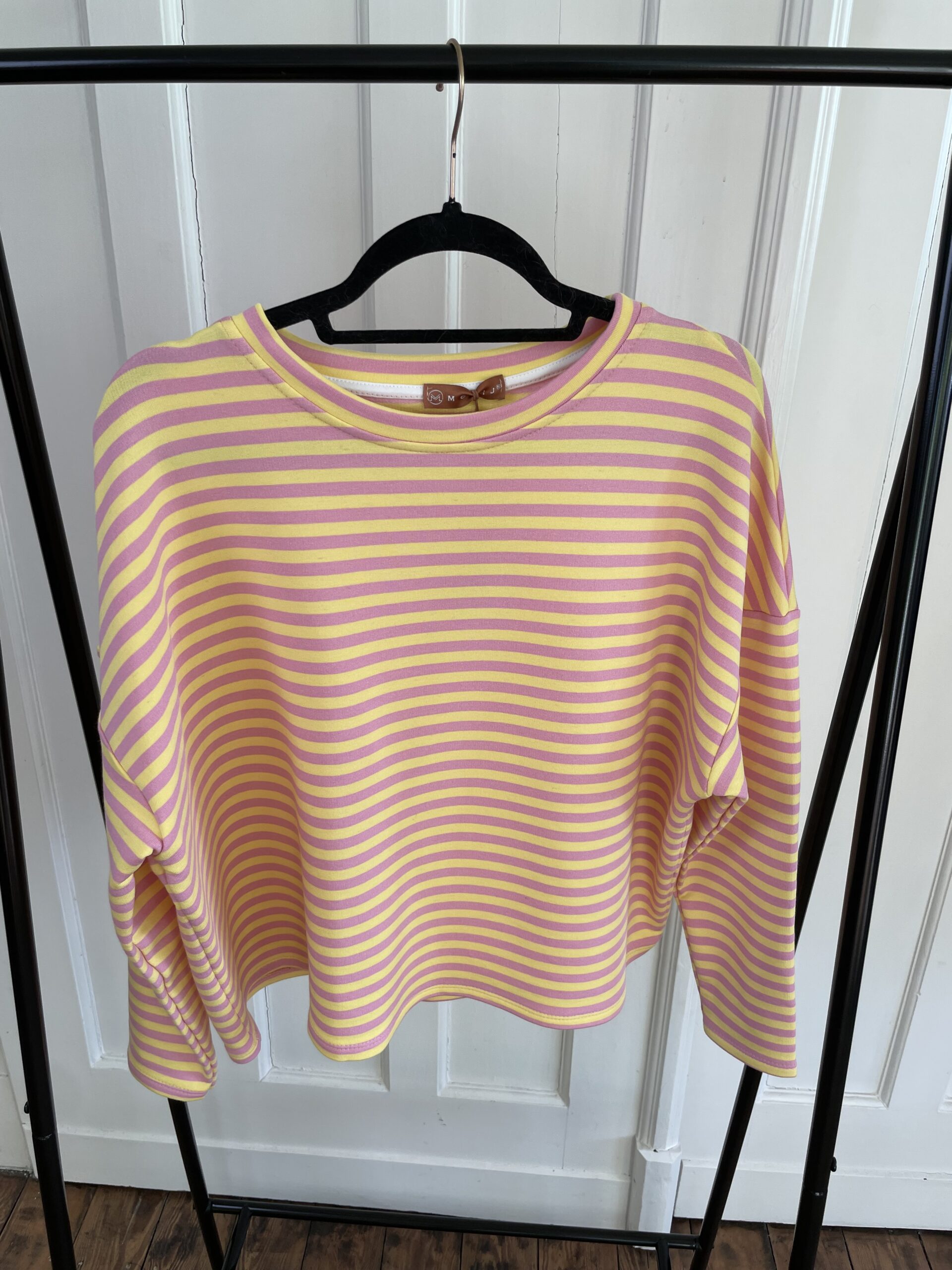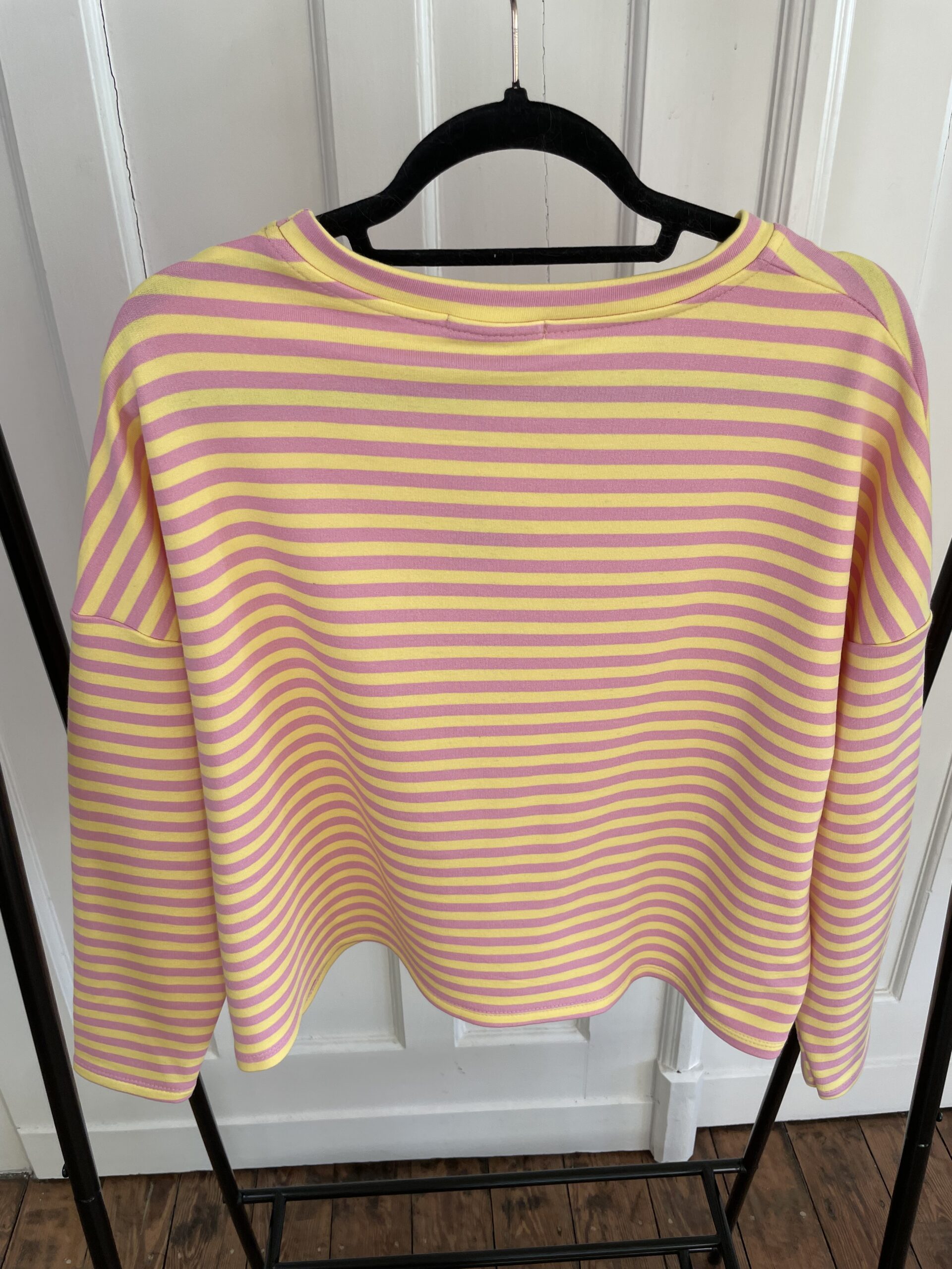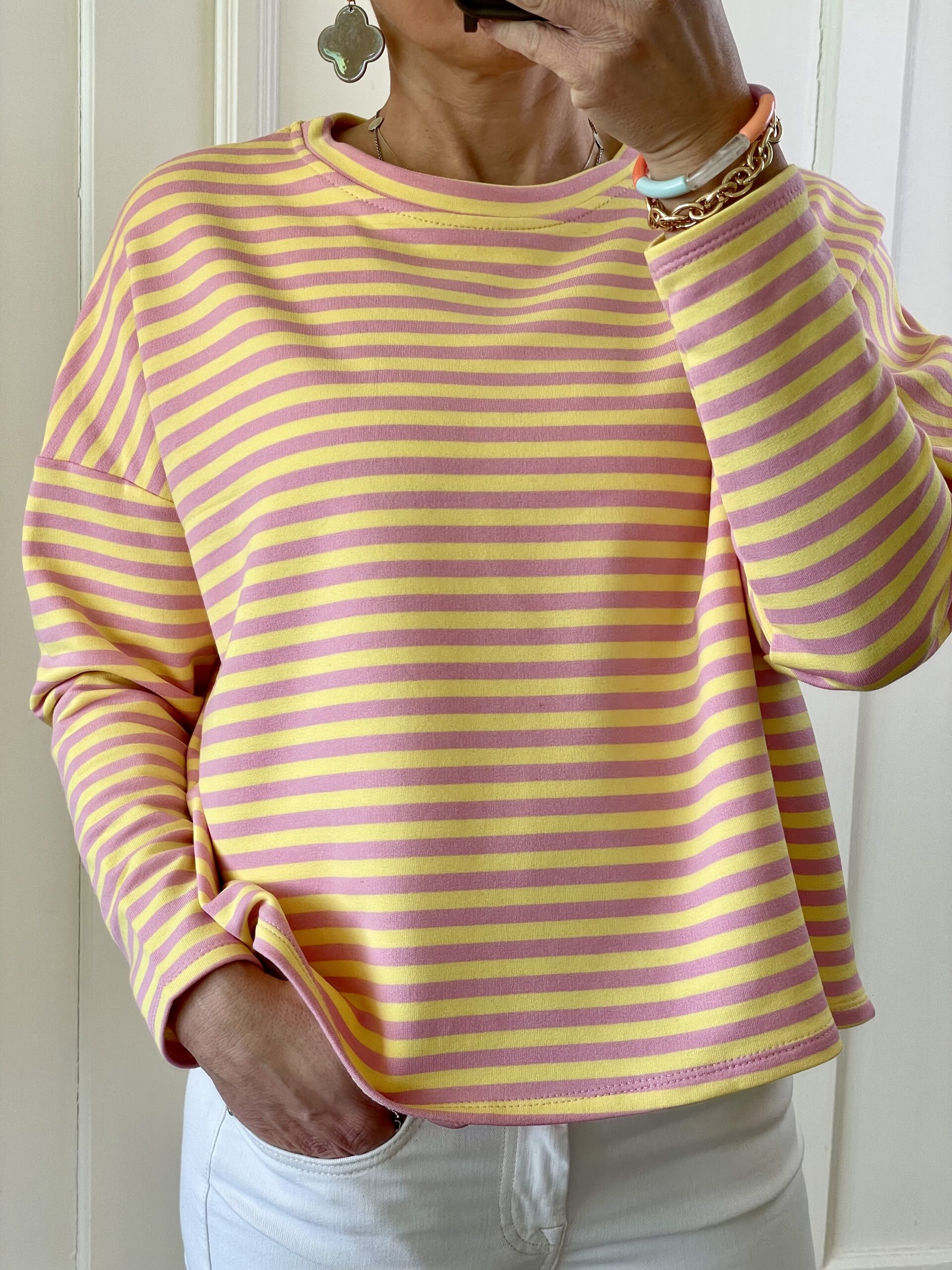 Rosé gelb gestreift und sehr frisch. Du kannst es sehr gut unter einem Blazer tragen oder auch unter Strickjacken.