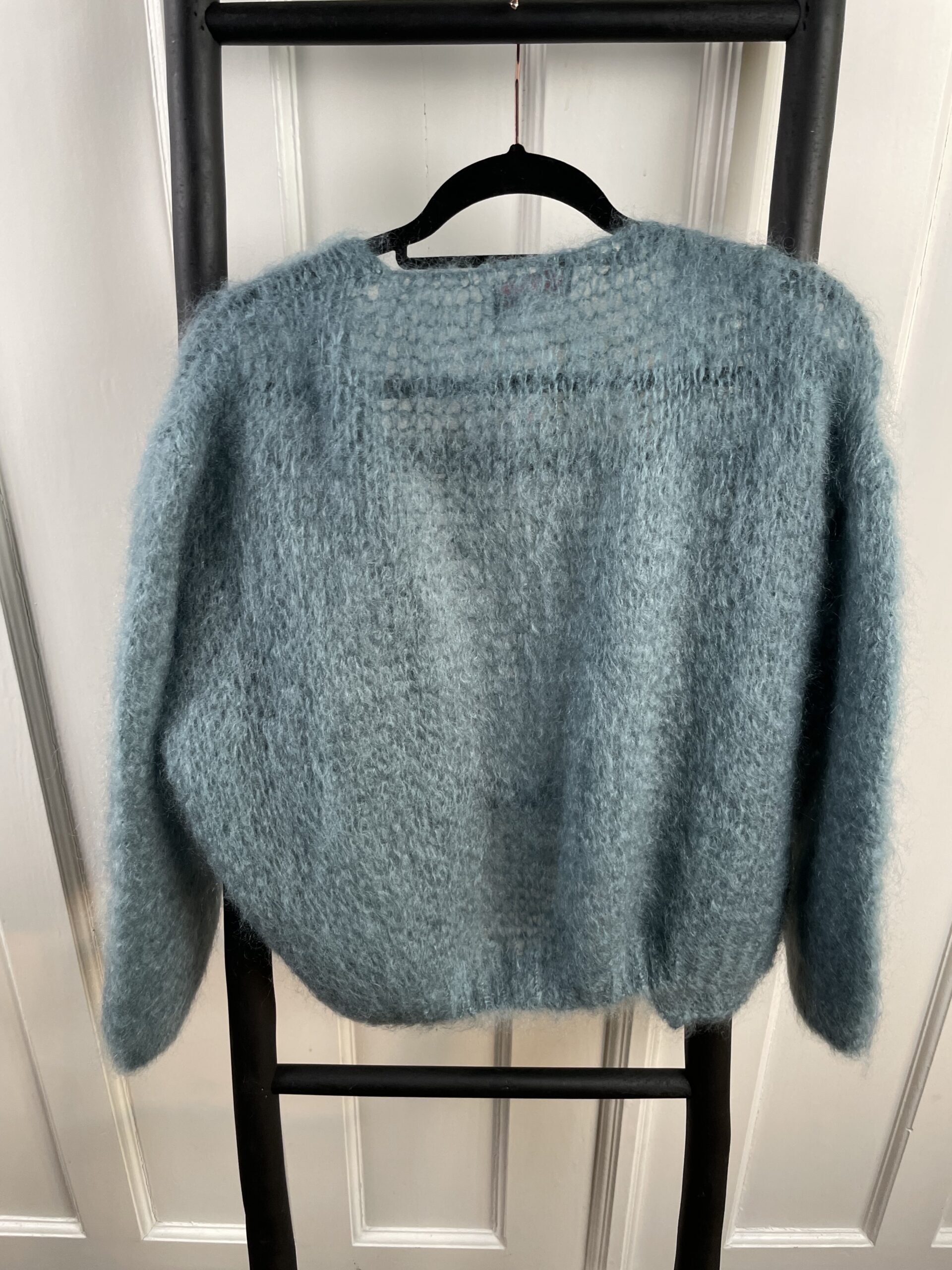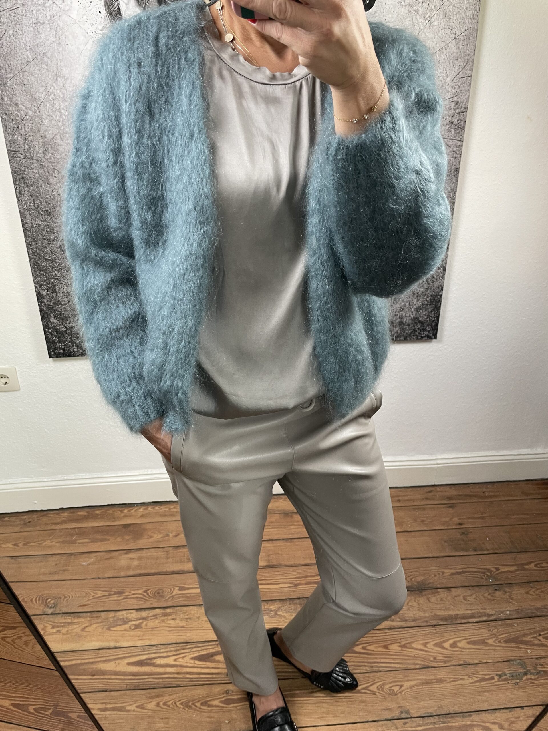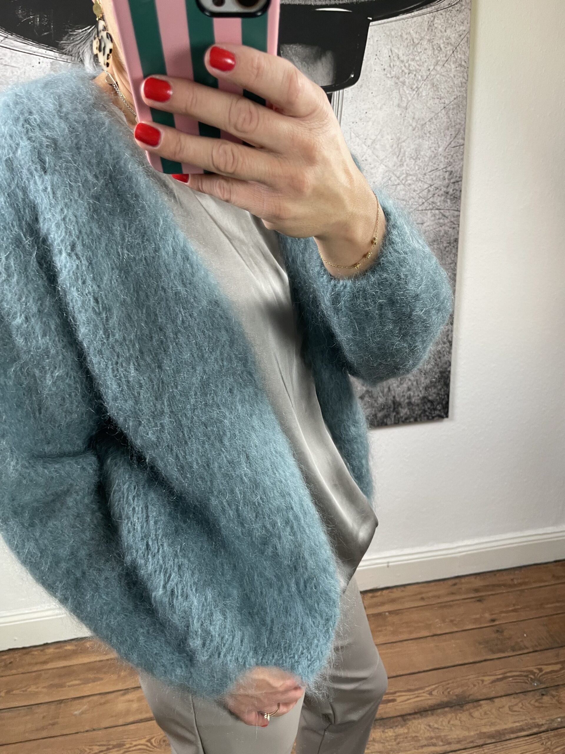 Diese Strickjacke hat einen tollen, lässigen Schnitt und wird offen ohne Knopf getragen.