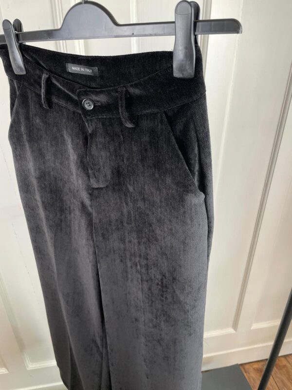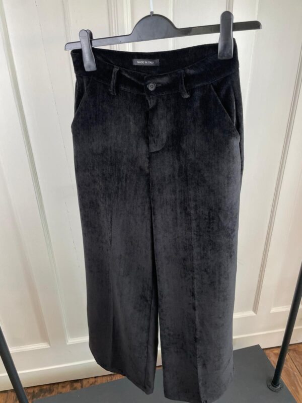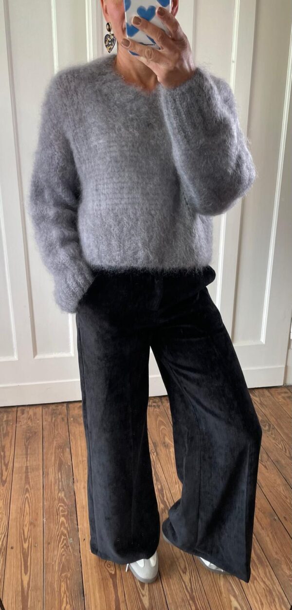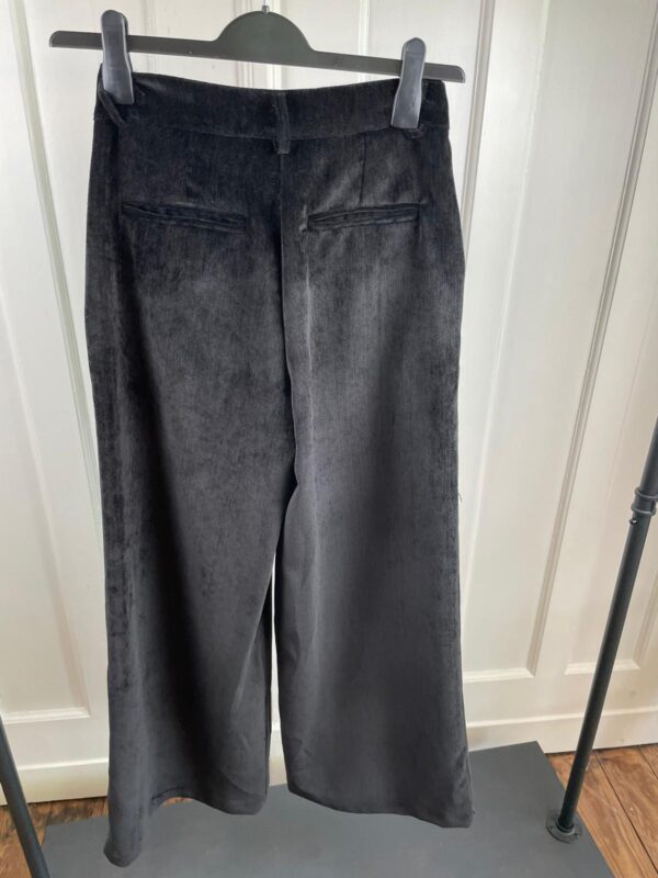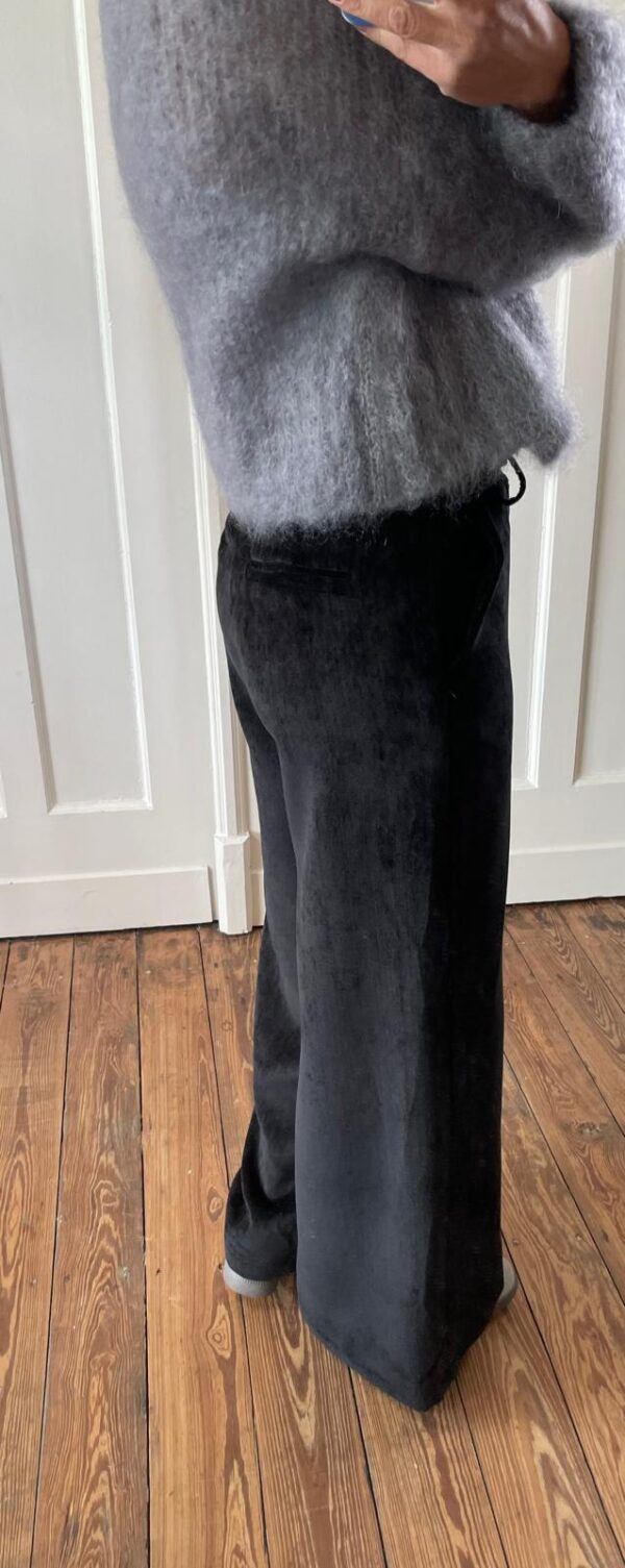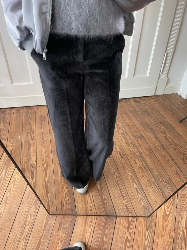 Die Hose hat Gürtelschlaufen und zwei seitliche Eingrifftaschen.