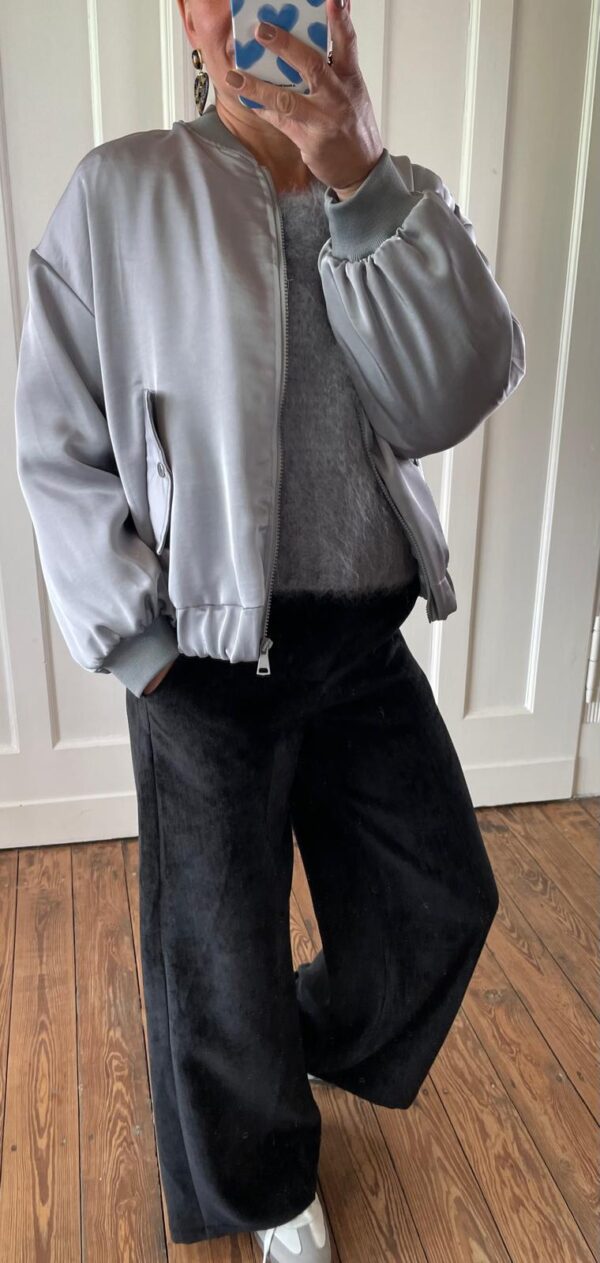 Sie wird mit einem Reißverschluss und einem Knopf verschlossen.